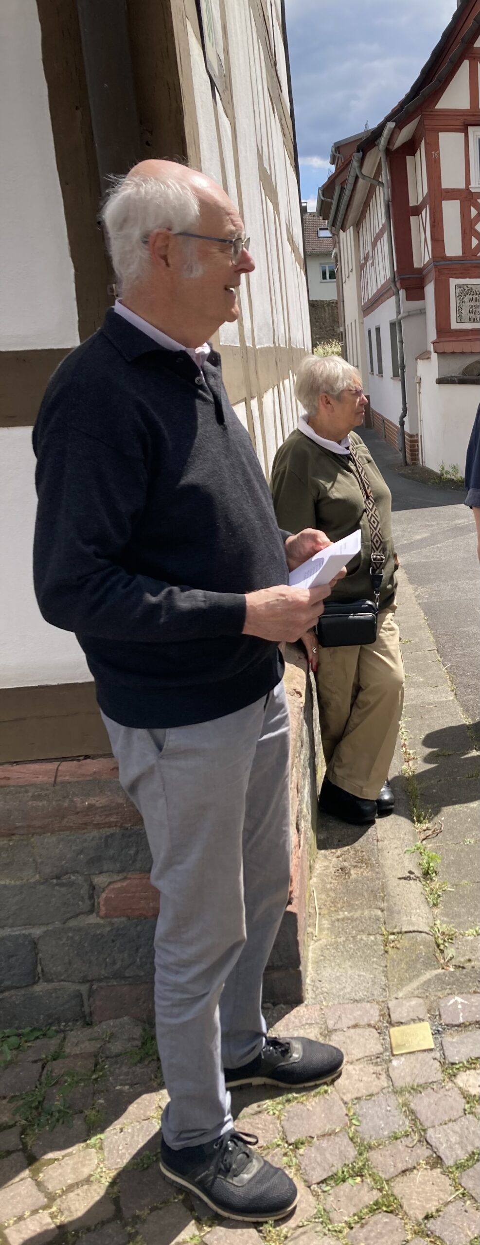 Die Zeremonie begann mit einer Ansprache von Herrn Begemann, der Informationen zur Person Theodor Ausäderers wie auch zur Lage der ehemaligen Synagoge in Hochstadt und dem Schulhaus (mit Mikwe) als letztem Wohnort der Familie gab.