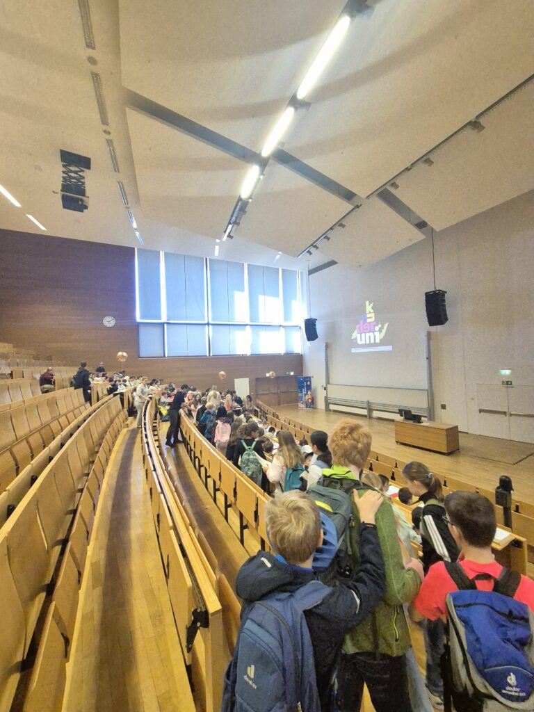 Der Ausflug begann mit einer gemeinsamen Anreise per öffentlichem Nahverkehr zur Haltestelle Holzhausenstraße. Nach der Ankunft an der Universität erhielten die Teilnehmenden die typischen Kinderuni-Materialien: einen Fragebogen, einen Ausweis sowie Abstimmungskarten in verschiedenen Farben für die interaktive Gestaltung der Vorlesung.