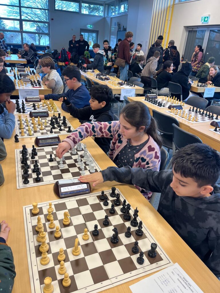 In 7 Runden mit je 15 Minuten Bedenkzeit wurde um den Titel des Hessenmeisters gekämpft. Es gab viele spannende Partien gegen sehr starke Gegner. Auch gegen manche gegnerische Vereinsspieler haben die Schülerinnen und Schüler des Albert-Einstein-Gymnasiums gewonnen! Die erste Mannschaft hat einen guten Mittelfeldplatz erreicht, das zweite und dritte Team auch ordentliche Plätze dahinter. Die Stimmung war bis zuletzt sehr gut. Die Schülerinnen und Schüler sowie der Schachtrainer, Herr Holger Meyer freuen sich schon auf das nächste kommende Turnier.
