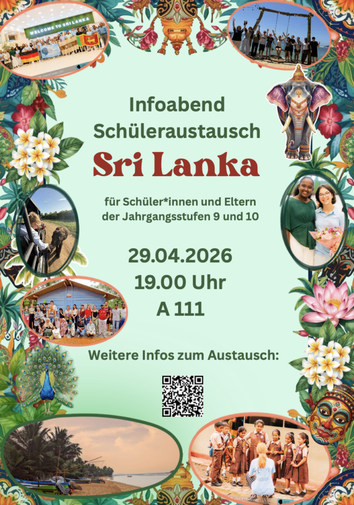 Startseite » Infoabend – Schüleraustausch Sri LankaInfoabend – Schüleraustausch Sri LankaAustausch24. April 202624. April 2026 Flyer digital Infoabend 29.04.2026Herunterladen Weitere Infos zum Austausch hier Schlagwörter:Austausch Vorheriger BeitragMehr als eine Nacht in der Schule – Oberstufe des Albert-Einstein-Gymnasiums lebt Gemeinschaft, Vielfalt und ZusammenhaltNächster BeitragFrühlingskonzert